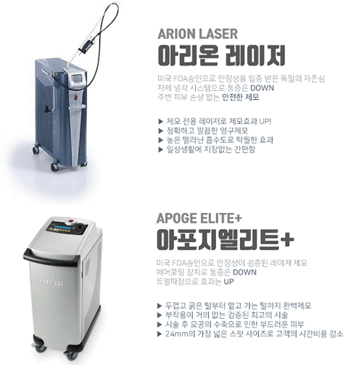블루미에서는 제모 전용 레이저 아포지엘리트플러스와 아리온